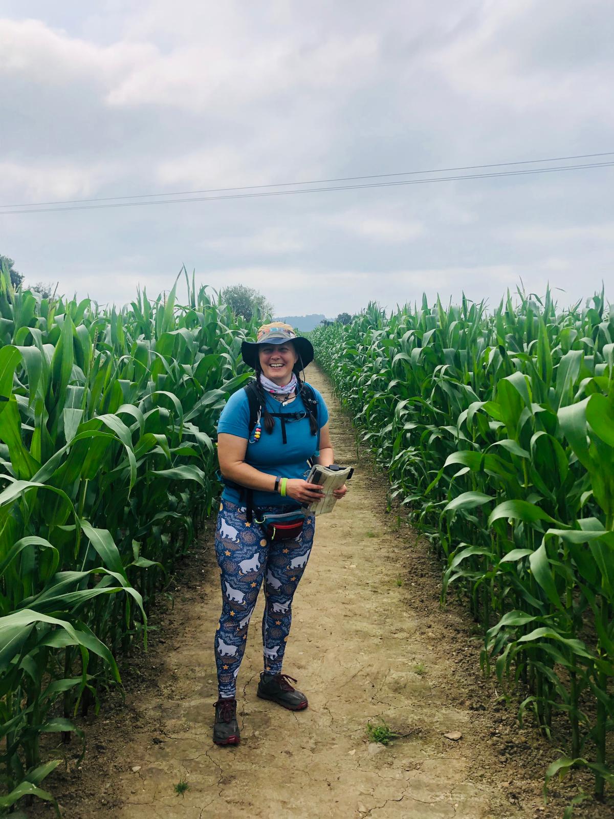 We were dropped off in Whitchurch at just after 7am and after a little faffing to get to the exact start, a sandstone arch on the edge of Jubilee Park, then a little more faffing with the GPS dancing around to find the right path indicated by a small waymark halfway up a lamppost hidden by trees. But we were off and quickly picked up the Whitchurch spur of the Llangollen canal and onto the Llangollen canal heading north. 5.5km along the canal settled us into the walk, then a few steps down at Willeymoor Lock lead across gently rolling fields. The fields were full of ripening wheat, barley and oats, maize towering over our heads and rich grass. The trail passes alongside farms and round a racehorse yard, the sandy track neatly raked ready for the day’s training. The rolling fields came to an end at Bickerton and the steep climb up to the fort, picking up the sandstone ridge. We had no time to explore on this walk, though there are many fascinating places along the way. Along the ridge of Bickerton Hill is Mad Allen’s hole, a small cave once occupied by a hermit called John Harris in the late 18th Century. Its tricky to get to but I may well return for an explore. Up on the ridge is a memorial and poem to Kitty, the wife of Leslie Wheeldon who helped the National Trust acquire the land.